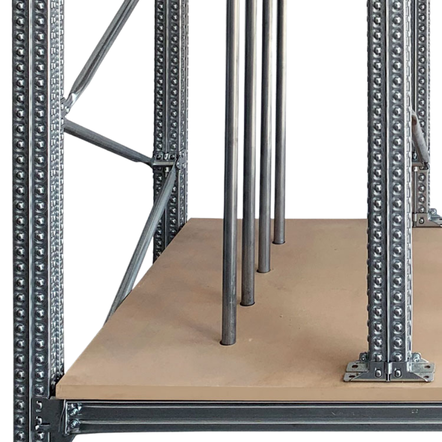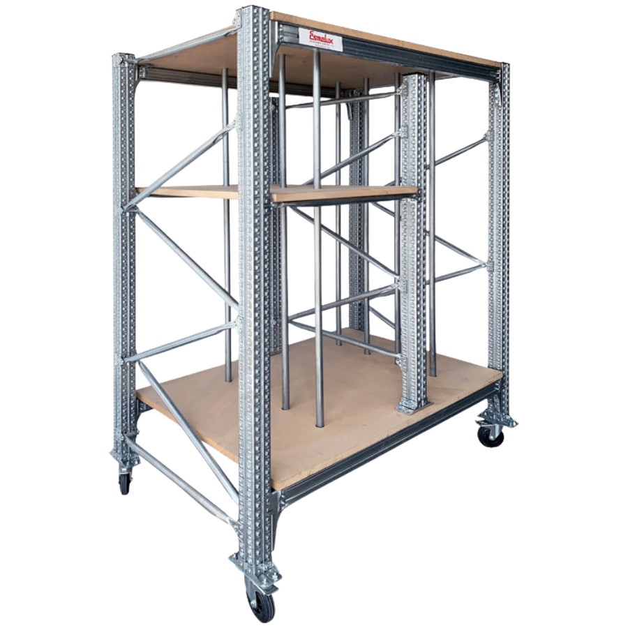 Estantería con ruedas para Almacenaje Vertical de cuadros, lienzos, marcos, etc. Su robusta estructura en acero galvanizado proporciona una gran capacidad de carga. Los tubos verticales redondos de acero cromado, permiten crear huecos para la colocación de material en vertical. El módulo también incluye un estante interior que permite almacenar material de varios tamaños en un mismo carro. Permite un fácil desplazamiento gracias a sus ruedas de Ø 125 mm.