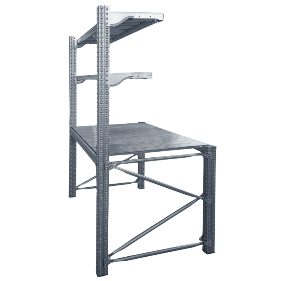 Este Banco de trabajo con 2 estantes en voladizo está dentro de nuestra Gama TS. Robusto y práctico para uso en talleres, tiendas de reparación, preparación de pedidos, etc. Está fabricado en acero galvanizado de máxima resistencia. Con 2 estantes en voladizo en la parte superior para colocar material, herramientas, etc. Con una capacidad de carga de 120 Kg cada uno. Ambos estantes son compatibles con la mayoría de los accesorios de Estantes Universal, como el Separador plástico desplazable, Separadores Móviles y Separadores Fijos del mismo fondo. La encimera es de paneles de metal. (Consultar).