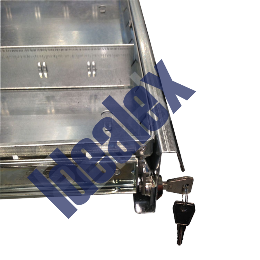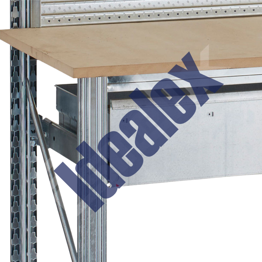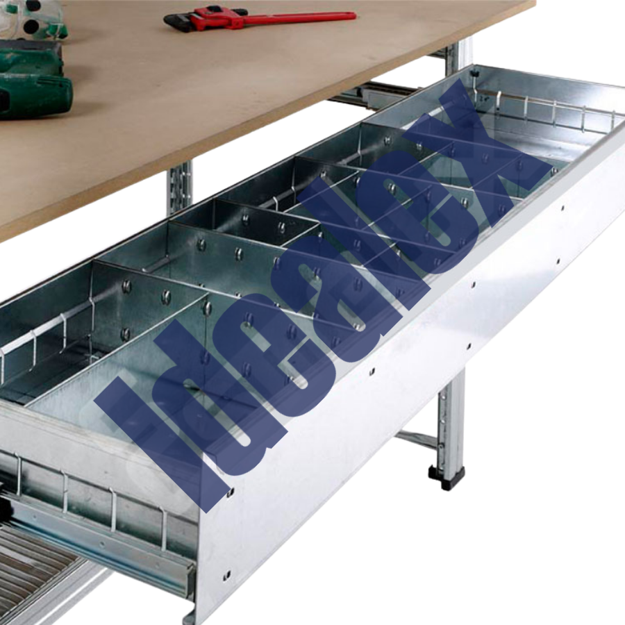 El cajón mide 165 mm de altura y cuenta con unas robustas guías telescópicas para hacer más cómodo su trabajo. Además, estos cajones extraíbles tienen opción de colocarles cerradura con llaves. Para ello todos los cajones tienen en la esquina inferior izquierda de la parte frontal, una embutición, que se quita fácilmente cuando se quiere colocar la cerradura..