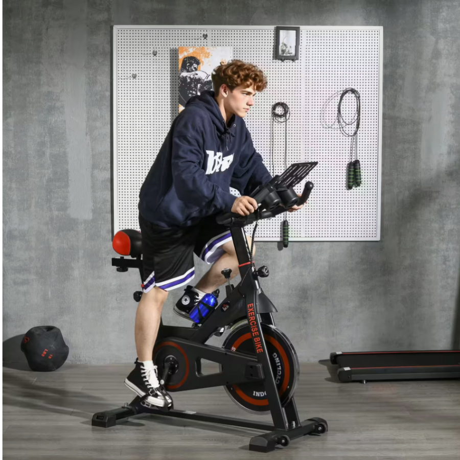 Esta bicicleta estática de HOMCOM está equipada con un volante de inercia de 8 kg, una pantalla de control LCD multifunción, asiento acolchado y ajustable vertical y horizontalmente.