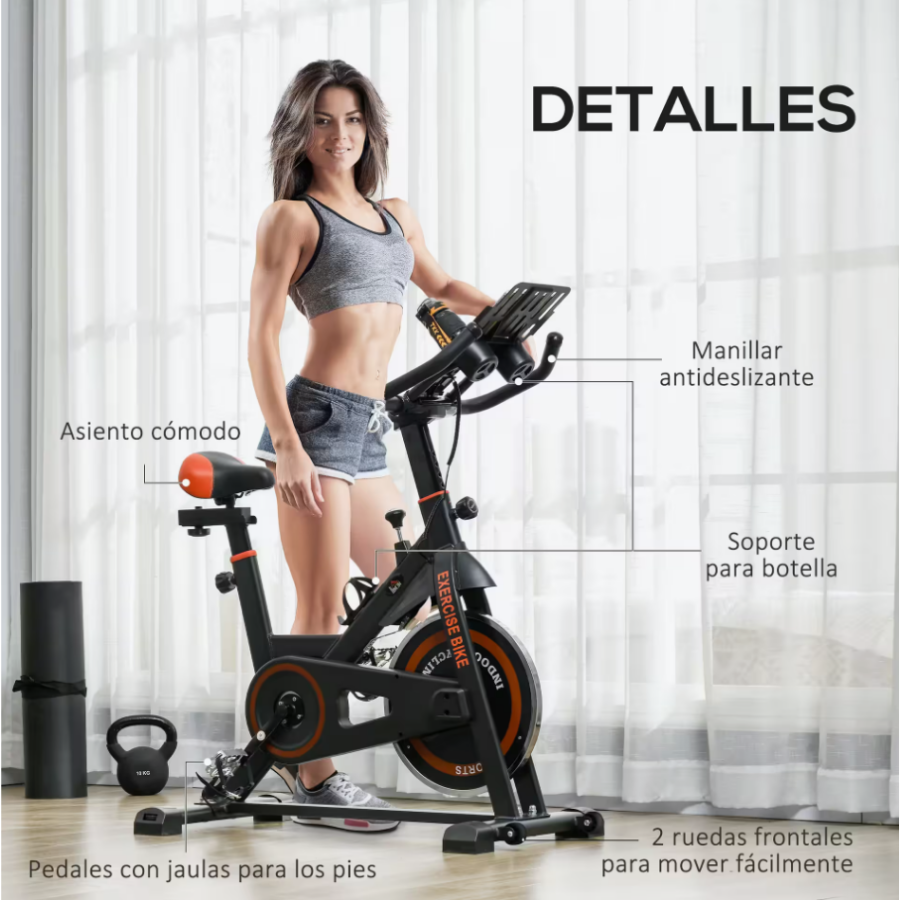 VOLANTE DE INERCIA DE 8KG CON PARO DE EMERGENCIA: Esta bicicleta estática cuenta con un volante de inercia de 8 kg para un pedaleo más fluido e intenso. La resistencia se ajusta con una perilla que también actúa como freno de emergencia para más seguridad.