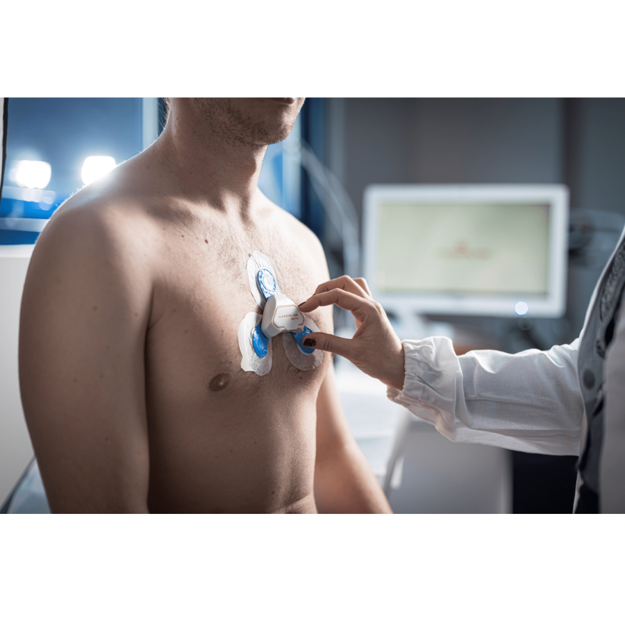 La aplicación es muy sencilla y se realiza mediante 3 electrodos estándar colocados directamente sobre el pecho del paciente.