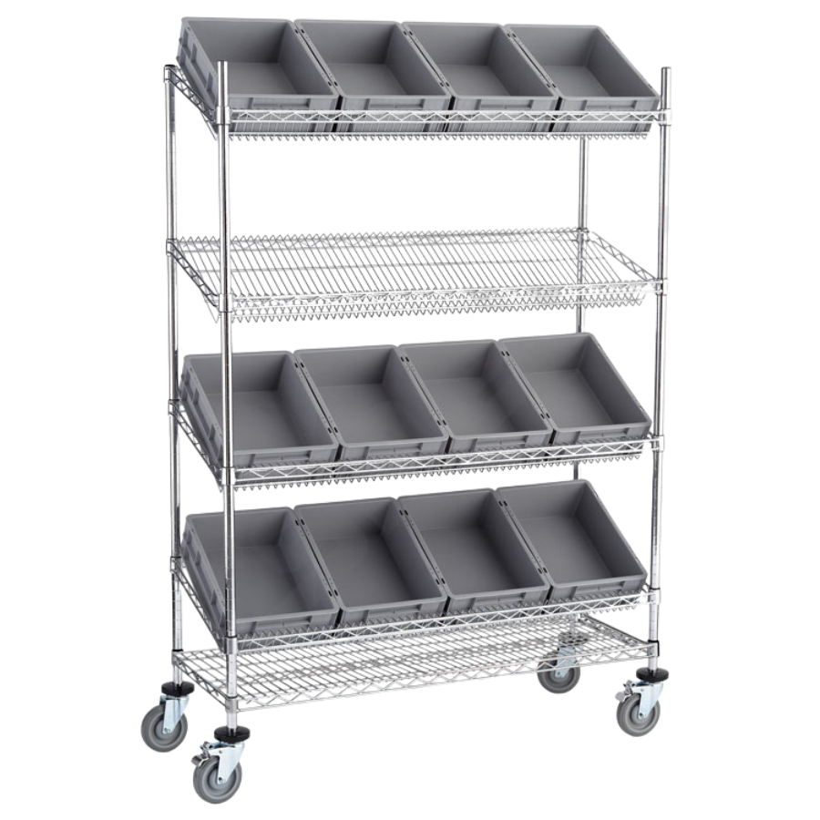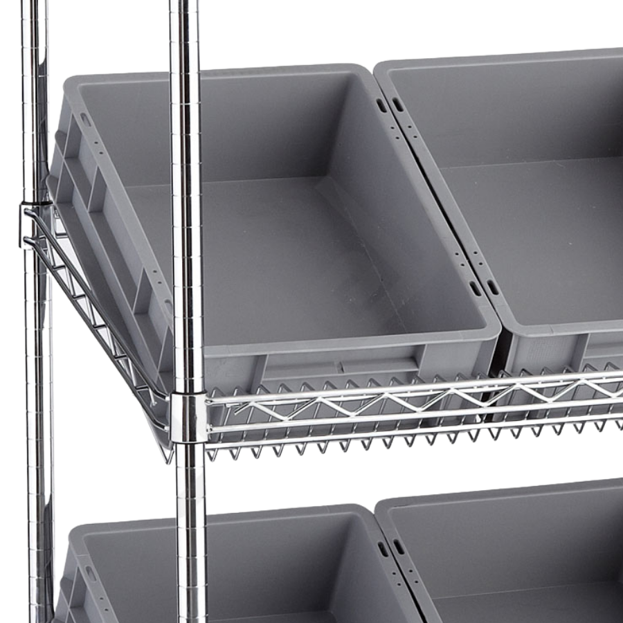 El Carro en acero cromado con estantes inclinados y con cajas Eurobox es una solución de almacenaje práctica para comercio. Ideal como expositor de mercancías ya que proporciona una mejor visibilidad del producto. Incluye 4 ruedas orientables de ø 125 mm de diámetro, dos de ellas con freno. La capacidad máxima del carro es de hasta 270 kg de carga. Para uso en suelos lisos sin desniveles. Las ruedas están fabricadas en goma termoplástica, TPR, de gran calidad y resistencia. No dejan marcas, son antihuellas y antihilos. Además las ruedas incorporan protectores de goma negra en forma de aro, que evitan desperfectos en caso de impactos accidentales. Para uso en ambientes secos.