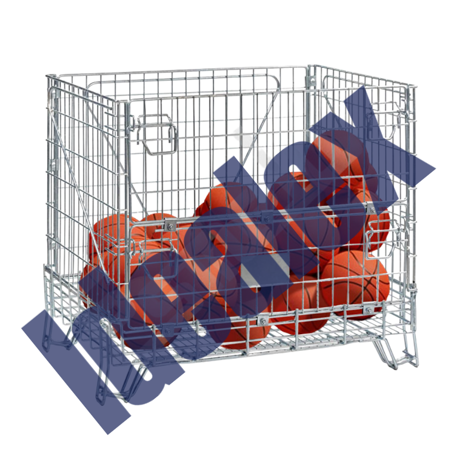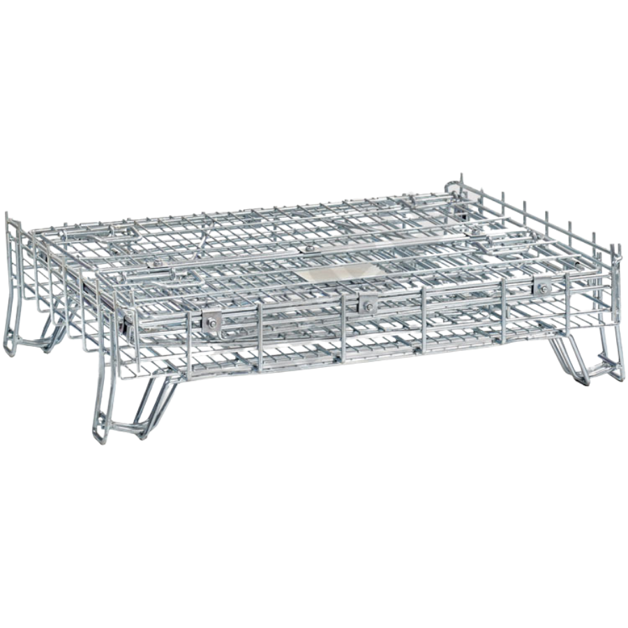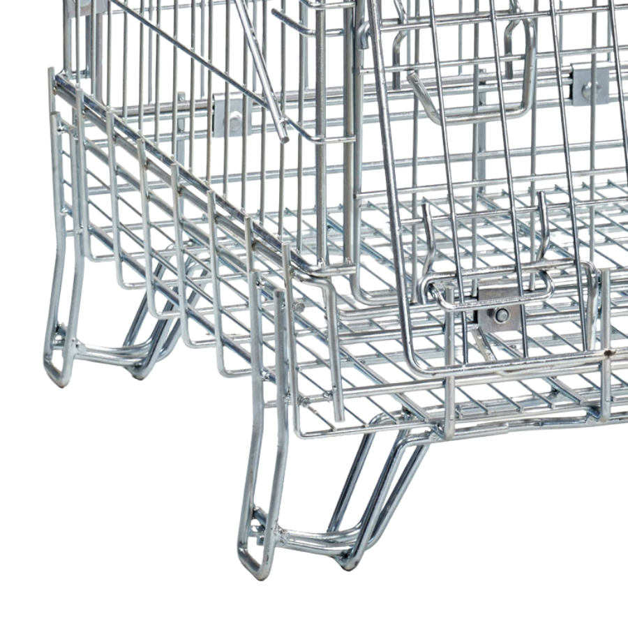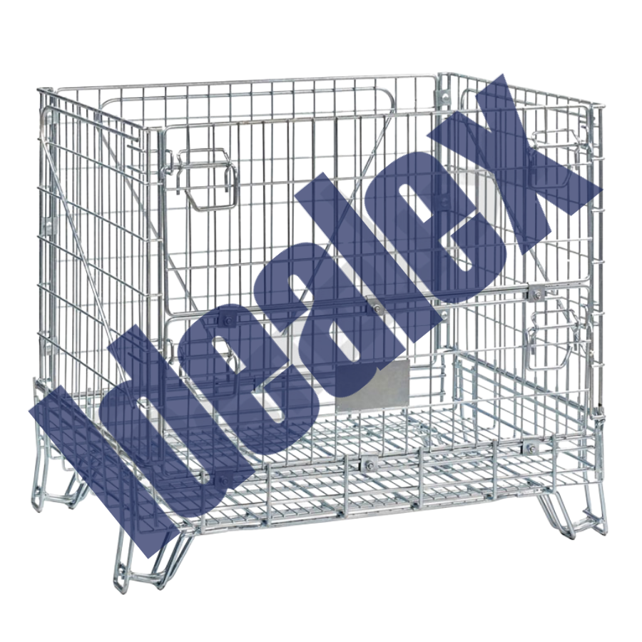 Contenedor Plegable para transporte y almacenaje de mercancía. Está fabricado en alambre cincado, con una puerta frontal abatible. Es apilable hasta 4 alturas, permitiendo fácil acceso al material almacenado gracias a la cómoda puerta abatible. Fabricado con varilla de diámetro 12 mm y de 5 mm. La malla es de 55 x 113 mm. El contenedor entero se puede plegar para ocupar un espacio mínimo con altura de 280 mm.