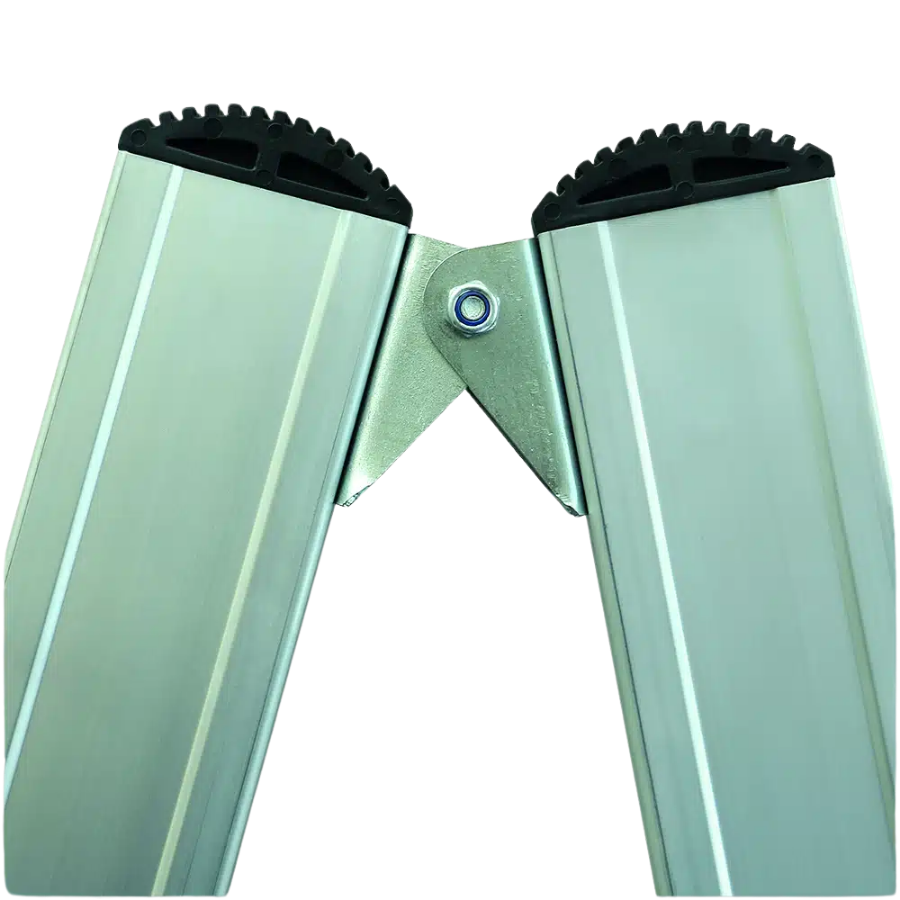 Fabricada con materiales de alta calidad, esta escalera cuenta con una bisagra de aluminio inyectado a 700 bares, garantizada de por vida y un pestillo de seguridad que mantiene la escalera cerrada de forma segura. La barra estabilizadora con refuerzos proporciona una mayor seguridad y estabilidad durante la subida. Los peldaños antideslizantes de 30×30 mm y el indicador del último peldaño de trabajo seguro pintado en color rojo ofrecen una mayor tranquilidad al trabajar en altura.