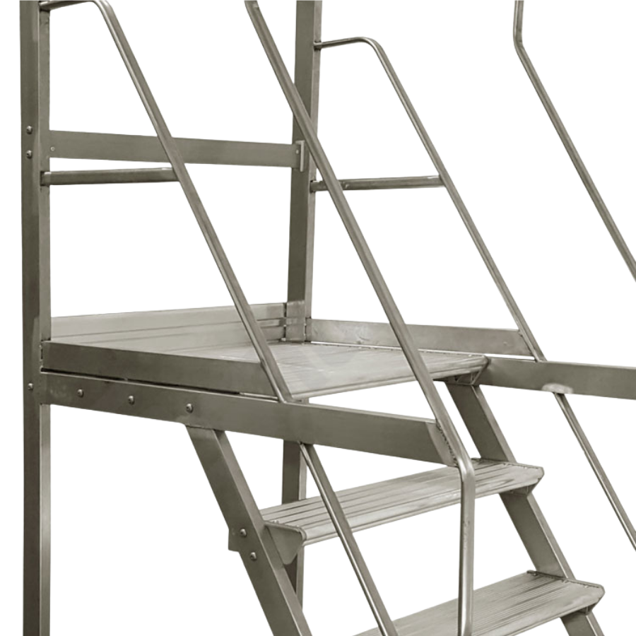• Los escalones antideslizantes de aluminio son muy amplios, y están sobre soportes de fundición.