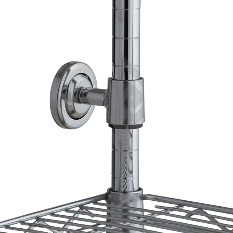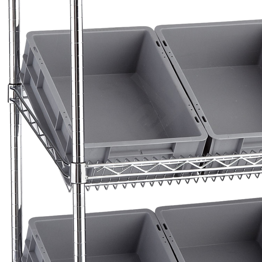 Estantería cromada con 4 estantes inclinados. Para la óptima exposición de sus artículos, especialmente indicada para libros y revistas. Con posibilidad de sujeción a la pared. Los estantes son de varilla cromada alto brillo, lo cual permite la circulación de aire y evitan el cúmulo de polvo. Si lo desea, puede incluir estantes lisos adicionales, de las mismas medidas (longitud x fondo) y combinar estantes inclinados y lisos en un mismo módulo.