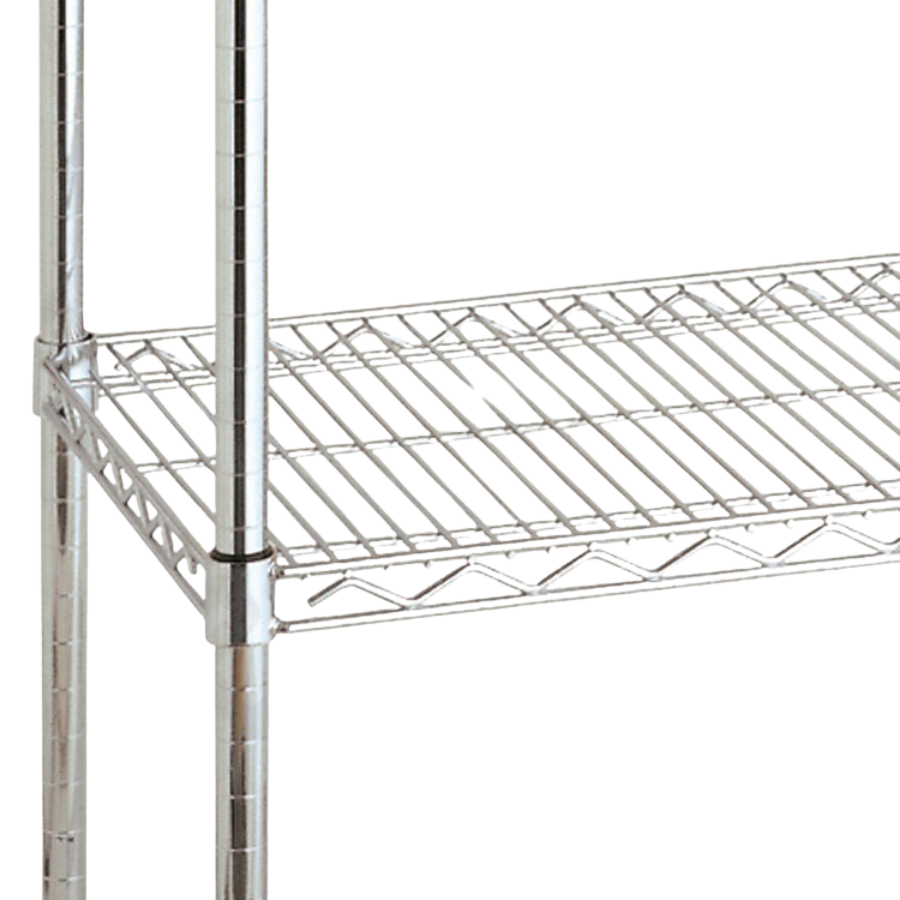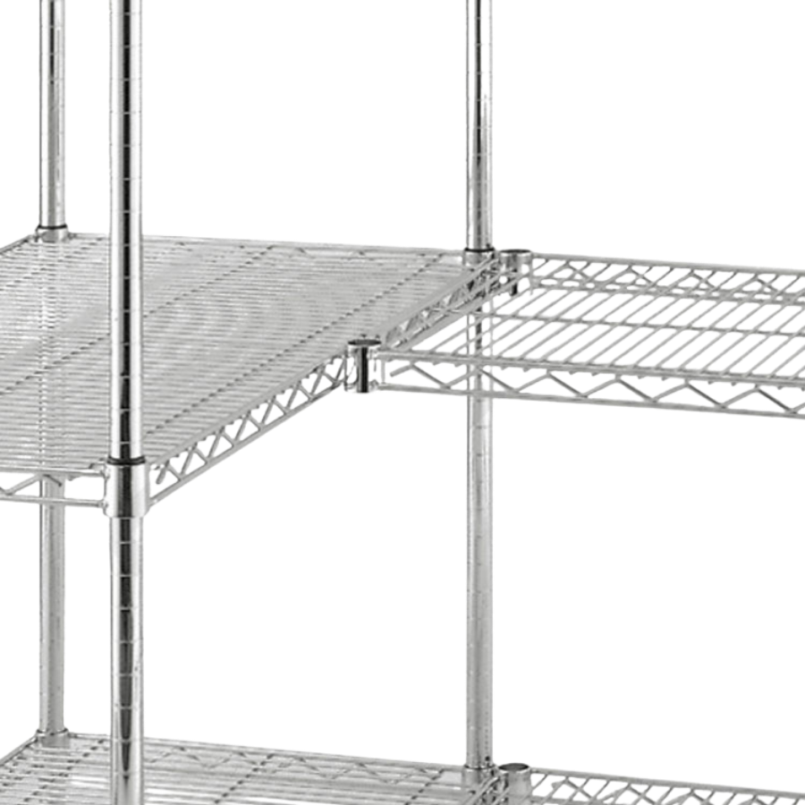 La Estantería esquinera en varilla de acero cromado alto brillo se compone de dos módulos de estantería de acero cromado en esquina con 4 estantes. Es la solución ideal para hacer rendir al máximo un mínimo espacio. Los tubos verticales llevan una base plástica regulable en altura para una fácil nivelación.