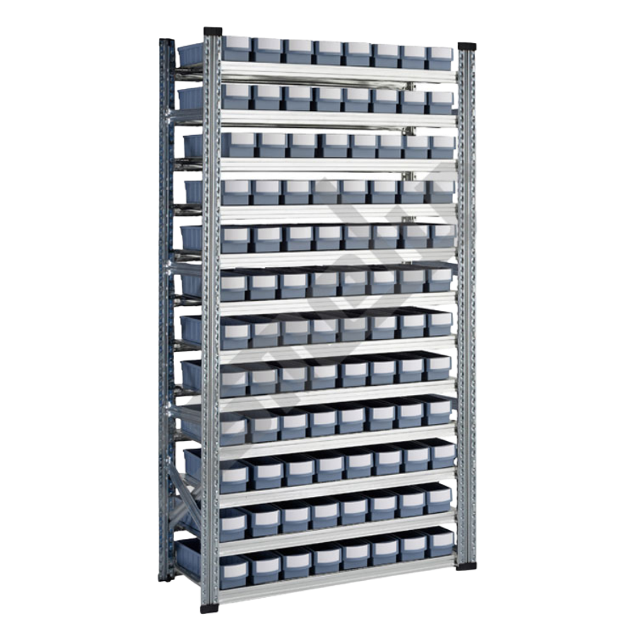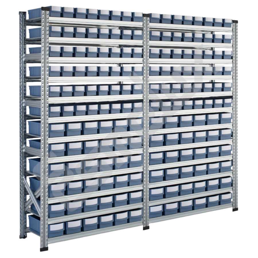 • Estanterías metálicas de acero galvanizado con cajones plásticos RGB para almacenaje de piecería.