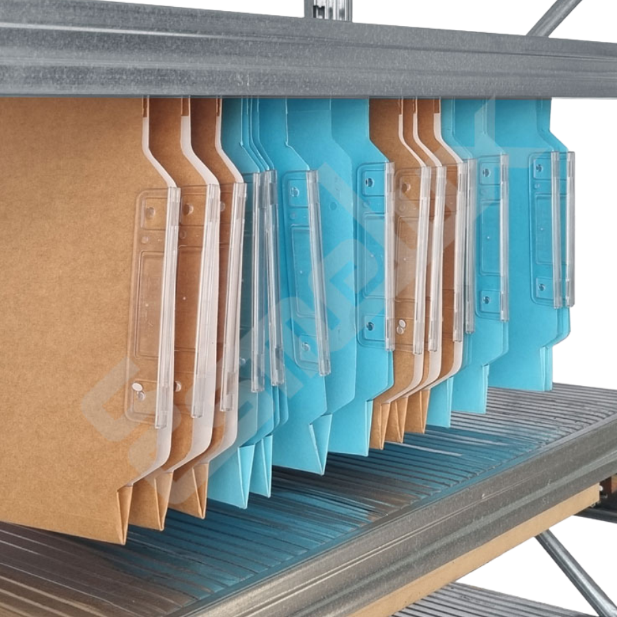 Se montan fácilmente sin tornillos ni tuercas. Permite tener una estantería llena de carpetas colgantes con visor lateral con estos estantes especiales. (En una estantería de 2.000 mm de altura, entran hasta 5 niveles). Ver estantería para carpetas colgantes