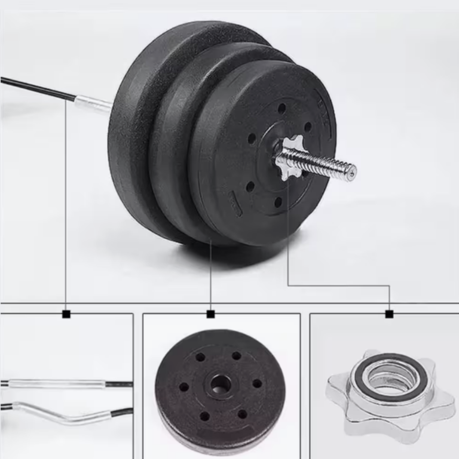 Este completo juego de barras y mancuernas es ideal para entrenar pecho, bíceps, brazos, tríceps, así como los músculos de la espalda y las piernas.