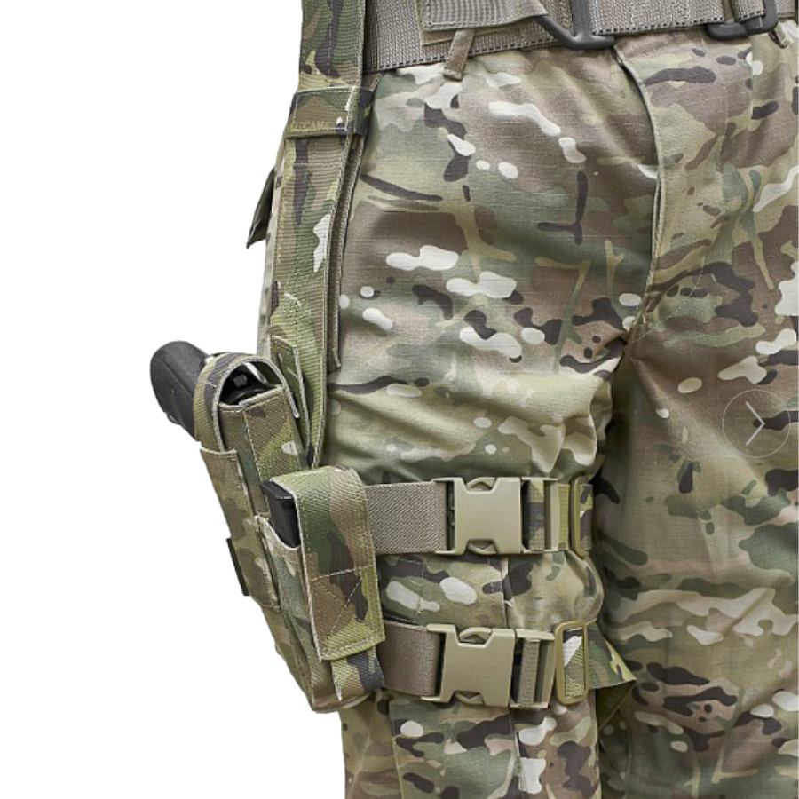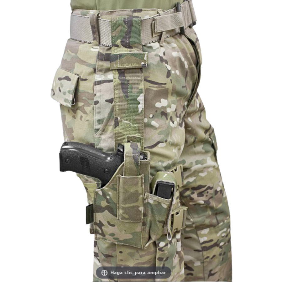 Funda de pierna ajustable, totalmente regulable, compatible con la mayoría de pistolas de 9 mm. Se sujeta al cinturón mediante una presilla regulable en altura y al muslo con dos correas ajustables con cierres de liberación rápida. Es compatible con la gama de cinturones tácticos, cinturones de servicio y cinturones de combate de Warriors. Fabricada con materiales originales de especificación militar estadounidense, tejido Crye MultiCam 500D y correas Murdock.