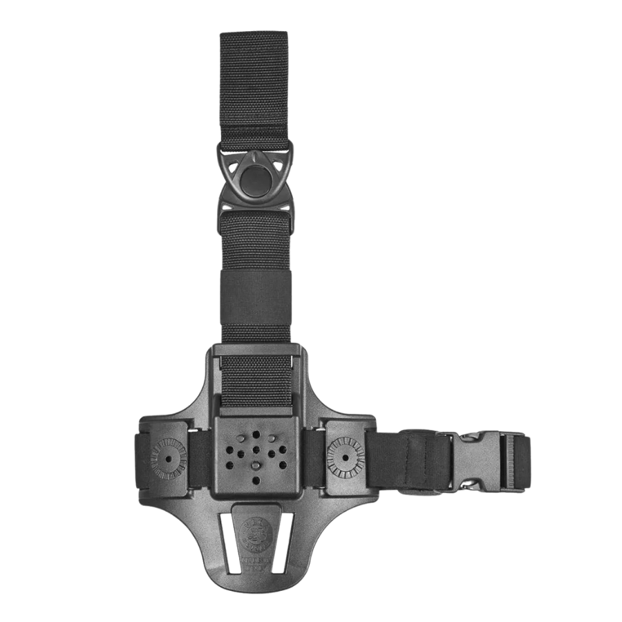 Equipada con una hebilla giratoria para facilitar el movimiento y una correa única con rieles antideslizantes para un anclaje seguro al muslo.