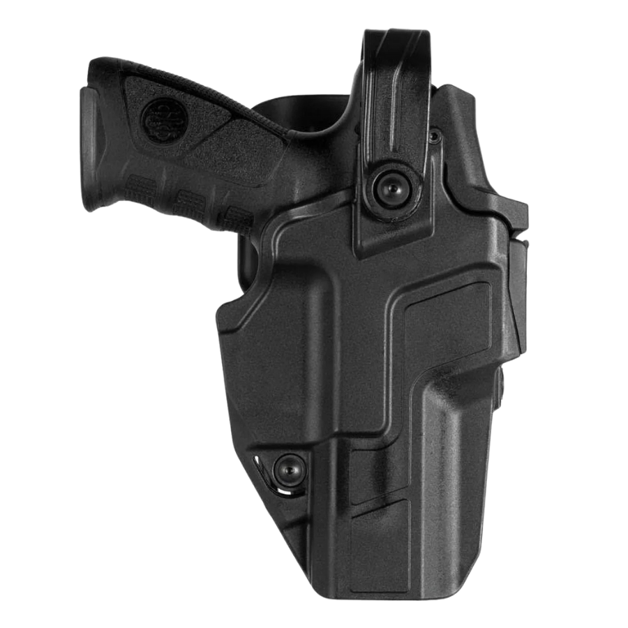 Sistema de seguridad superior «AUTO Push & Front» con correa giratoria que actúa sobre la parte superior del arma y se libera automáticamente con un movimiento hacia abajo del pulgar (código KARA8).