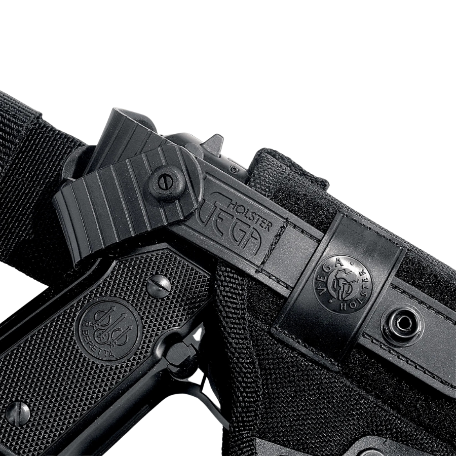 Esta funda táctica para el muslo, fabricada con nailon duradero, está diseñada para llevar armas de fuego de forma segura y cómoda.