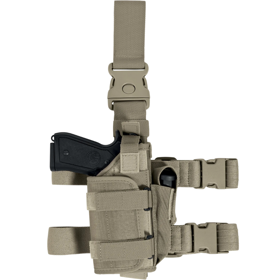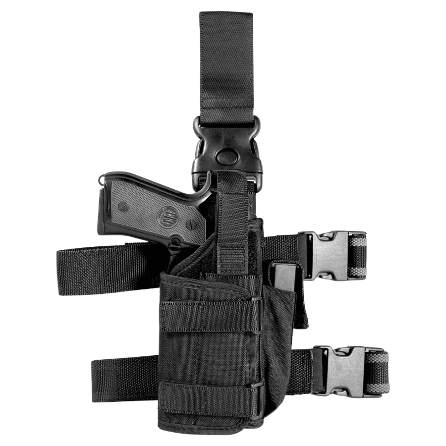 Esta versátil funda táctica para el muslo está diseñada para pistolas con accesorios de luz o láser, y ofrece opciones de transporte seguras y personalizables.
