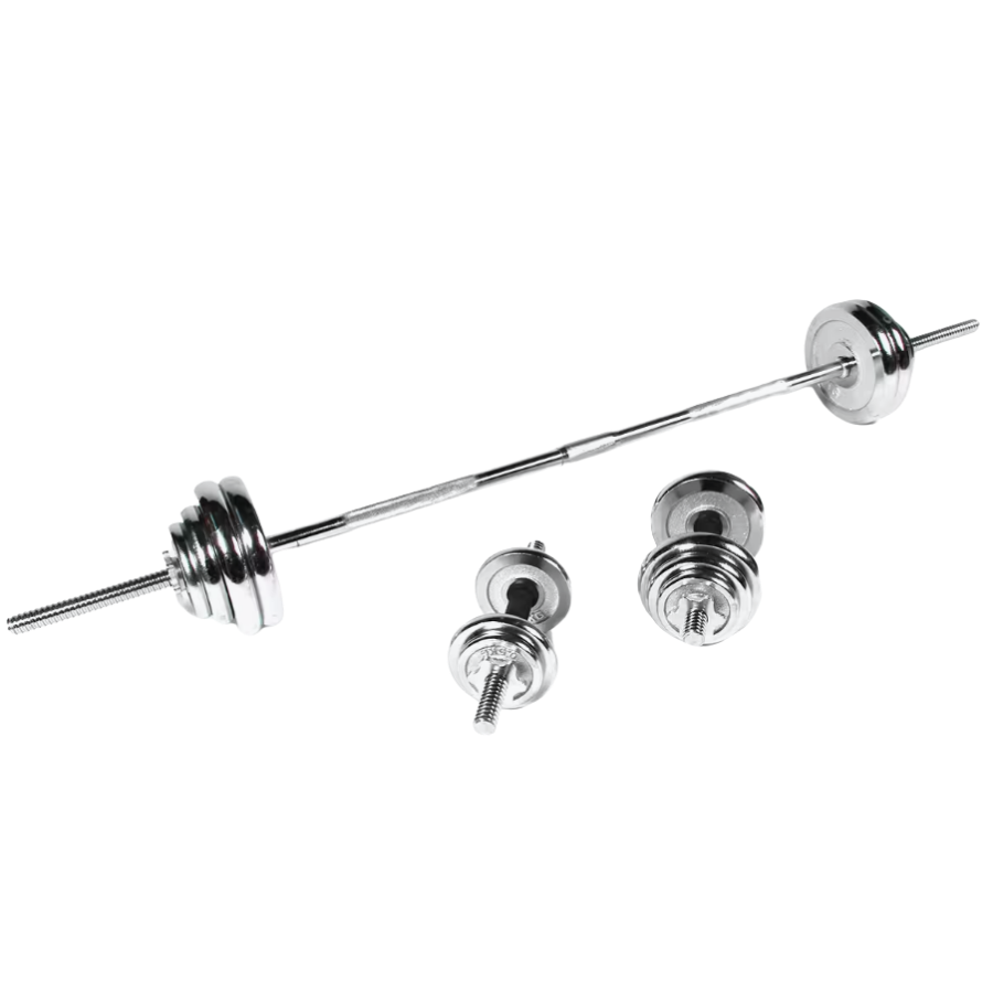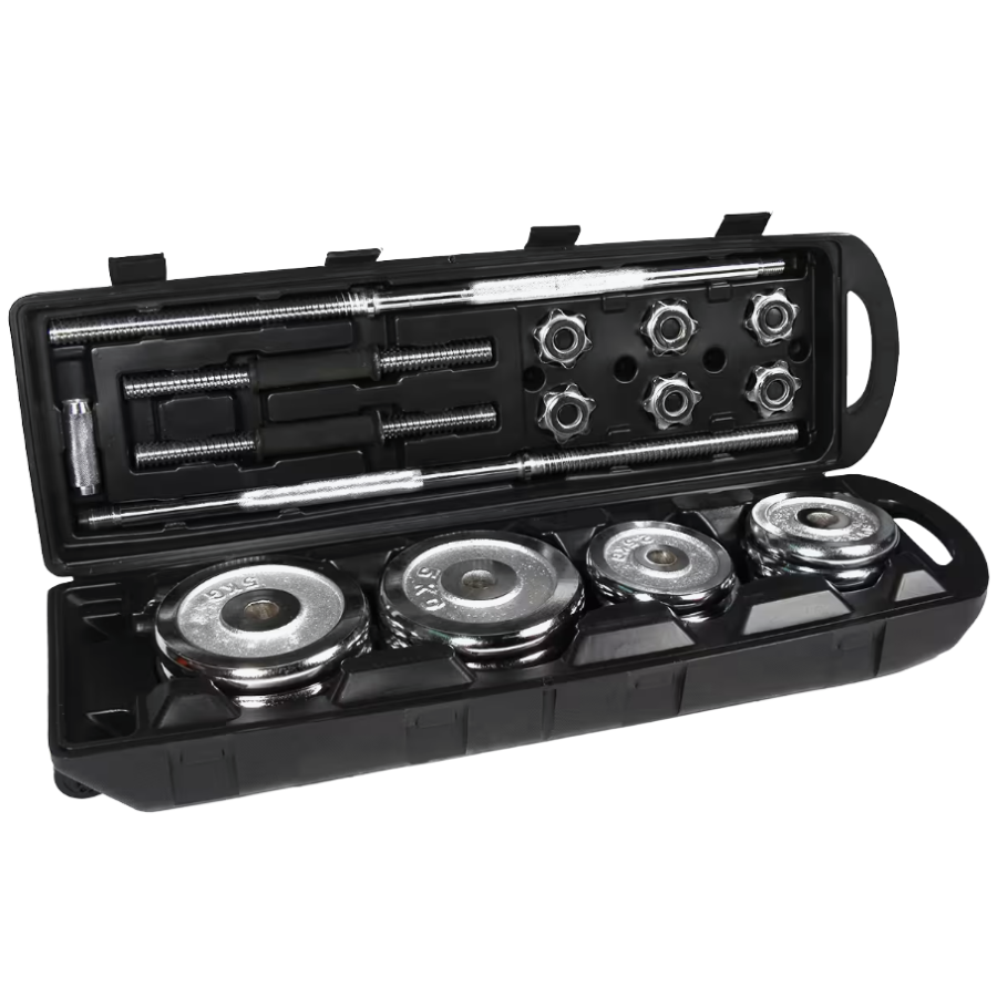 Este kit completo de 50 kg con barras y mancuernas ofrece una solución versátil para un entrenamiento de todo el cuerpo. Ideal para entrenar en casa, facilita la adaptación de la carga a tu