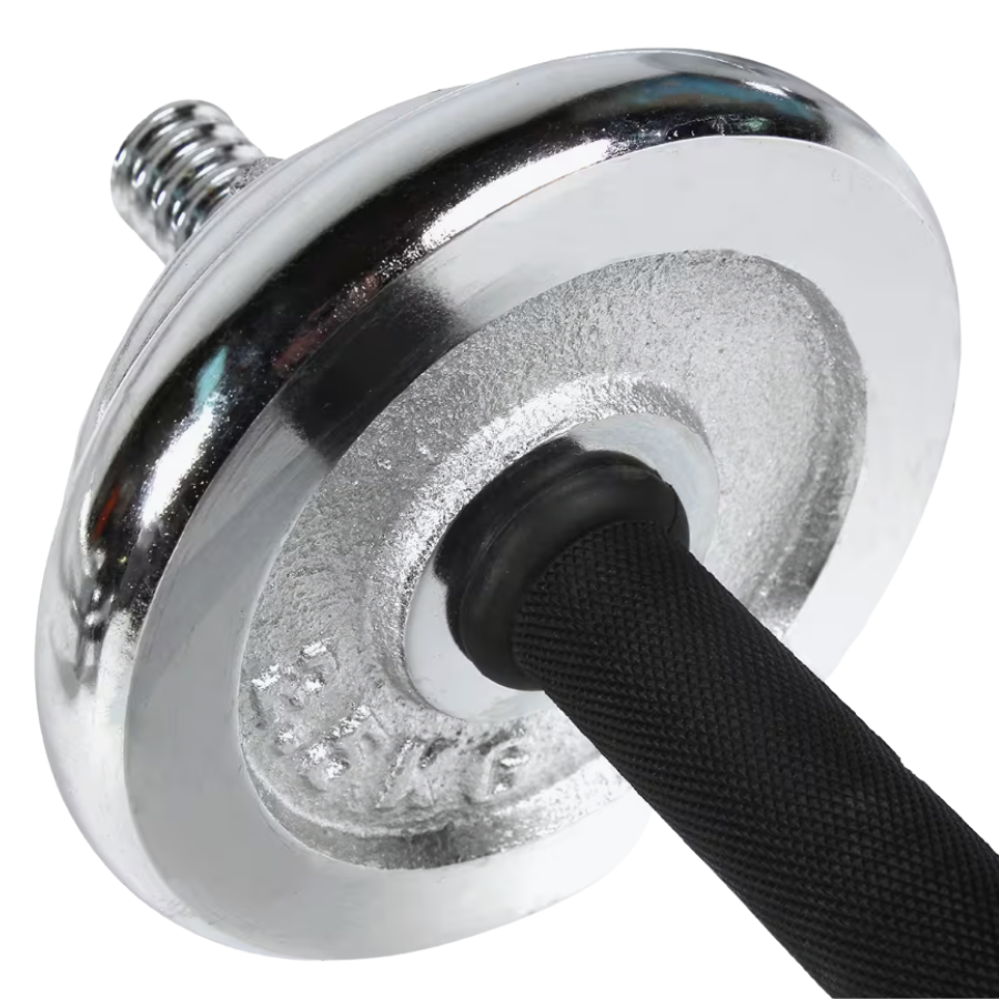 Las empuñaduras de las mancuernas están diseñadas para ofrecer una comodidad óptima y un agarre ergonómico. La barra cromada presenta ranuras para mejorar el agarre, y las abrazaderas de seguridad garantizan que las pesas queden bien sujetas, reduciendo el riesgo de deslizamiento durante el entrenamiento.