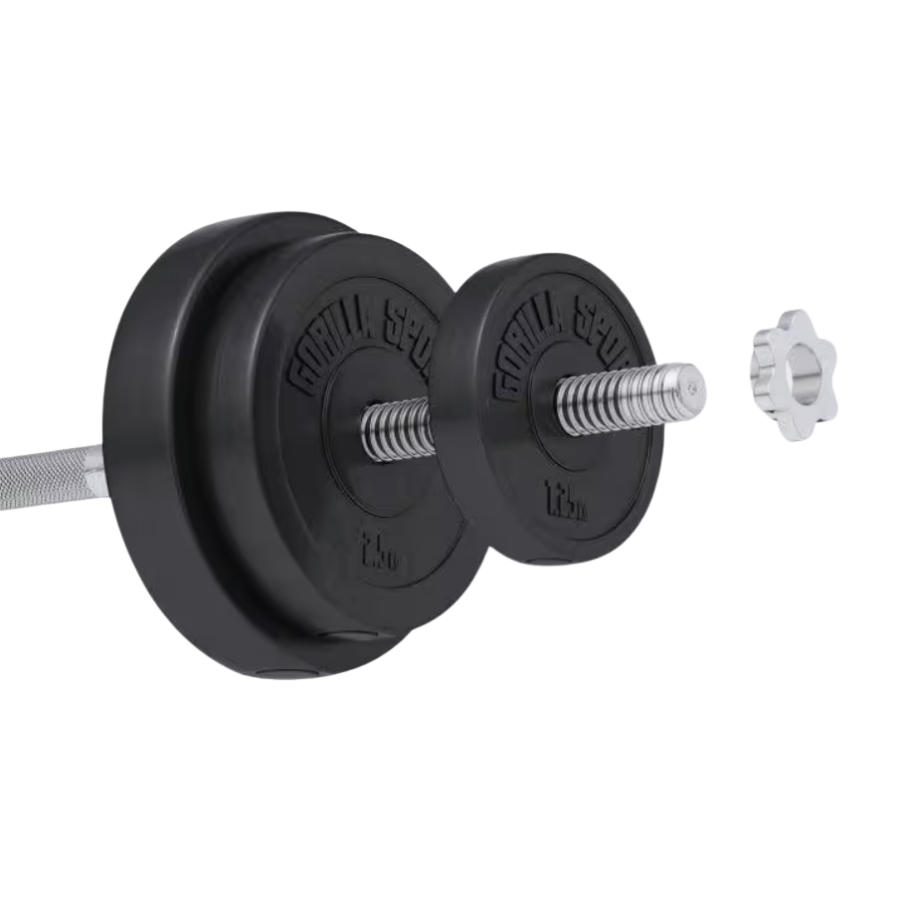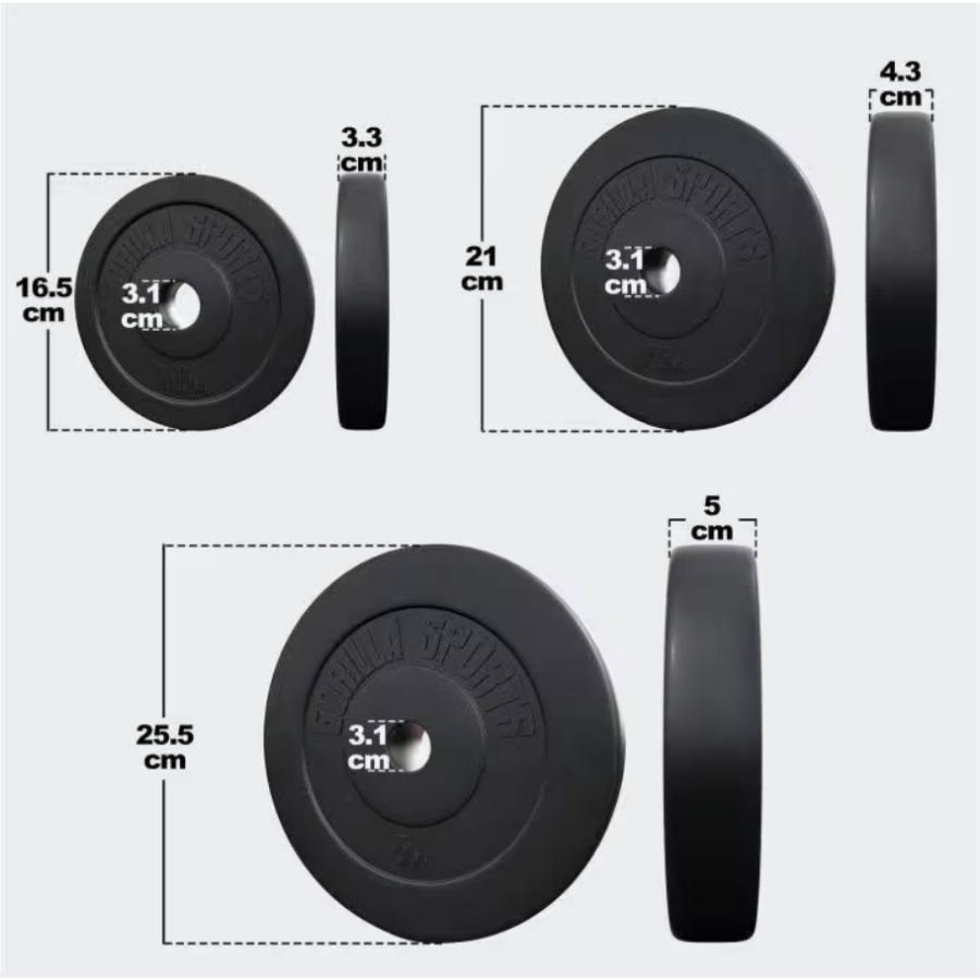 Se adapta a todas las barras de pesas de 30 mm Color: Negro Relleno de cemento compactado Especificación de kg impresa en la superficie Resistente a los arañazos y a los impactos La superficie de plástico absorbe el exceso de ruido – ideal para uso doméstico