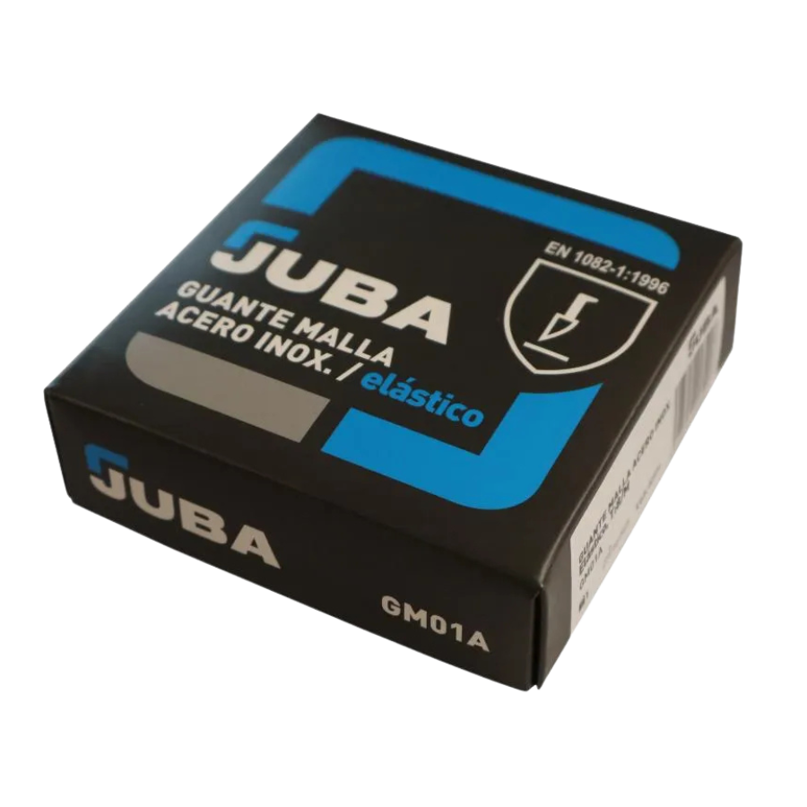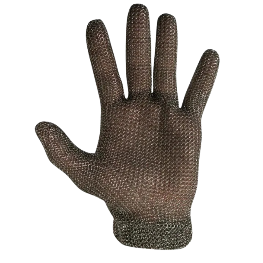 Guante de malla metálica de acero inoxidable con sistema de tensión autoajustable.
