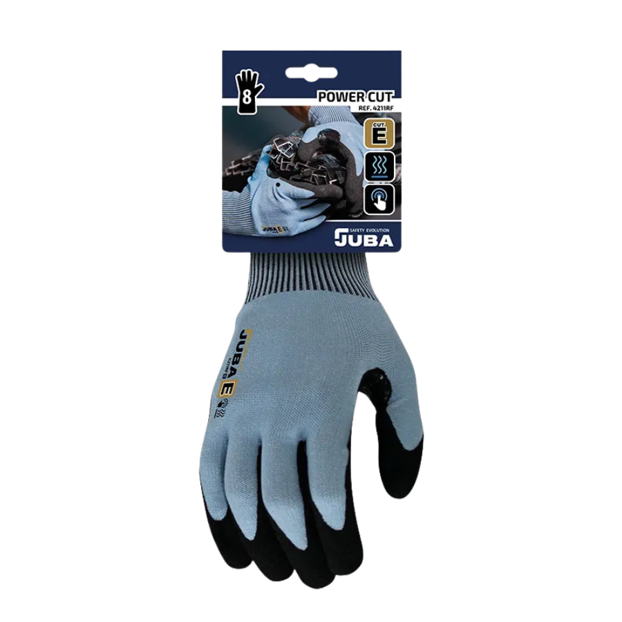Guante con alta resistencia al corte que incorpora la fibra textil K-Rock®, la nueva tecnología de corte de Juba, recubierto de nitrilo foam arenoso en la palma.