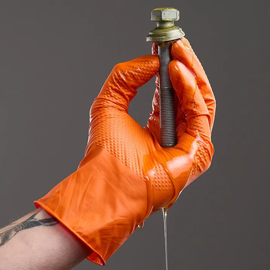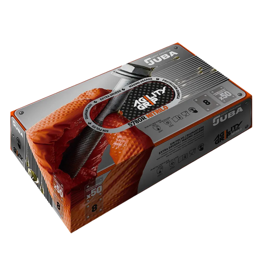 Guantes desechables de nitrilo diamantado sin polvo en color naranja.