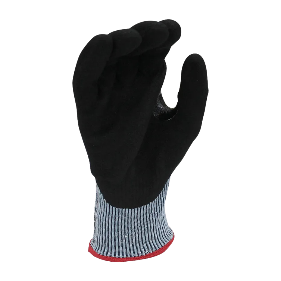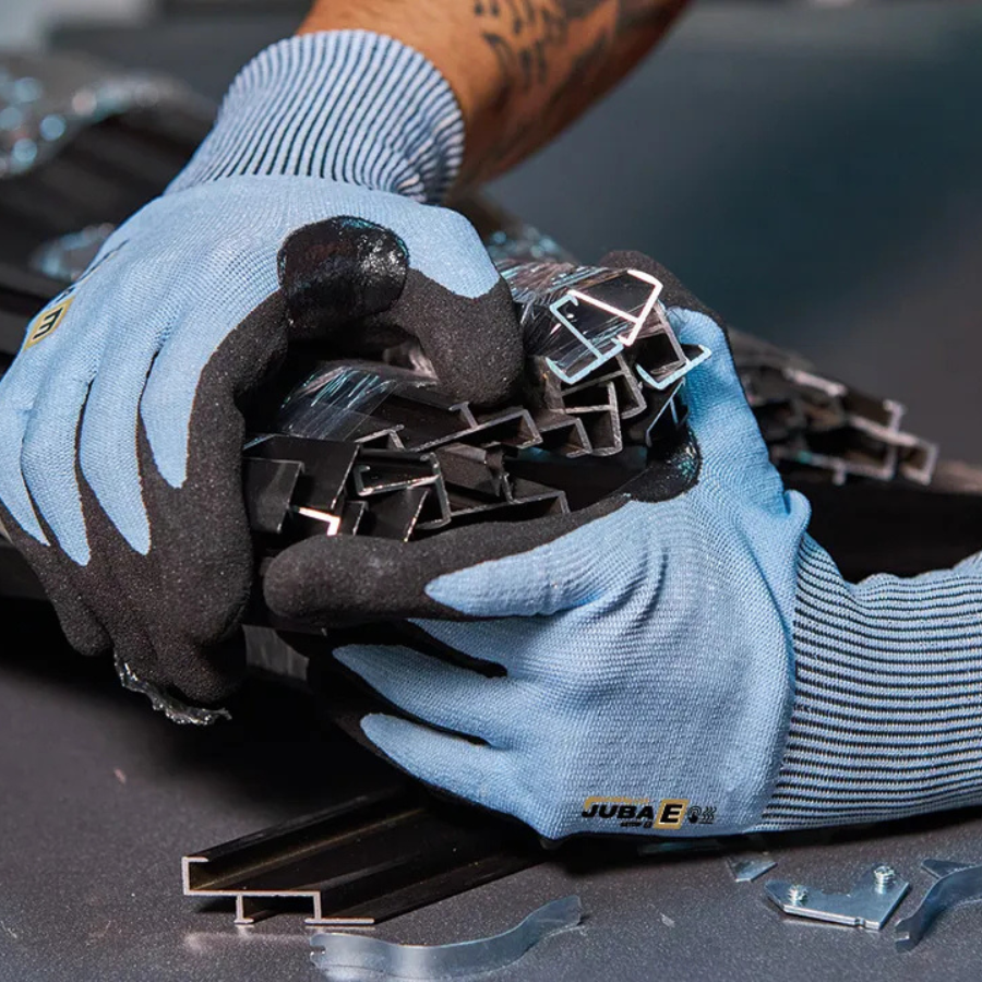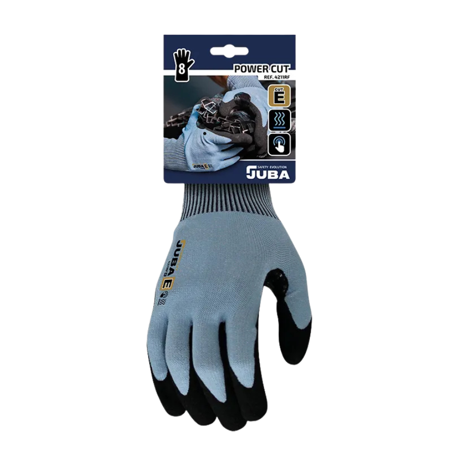 Guante con alta resistencia al corte que incorpora la fibra textil K-Rock®, la nueva tecnología de corte de Juba, recubierto de nitrilo foam arenoso en la palma