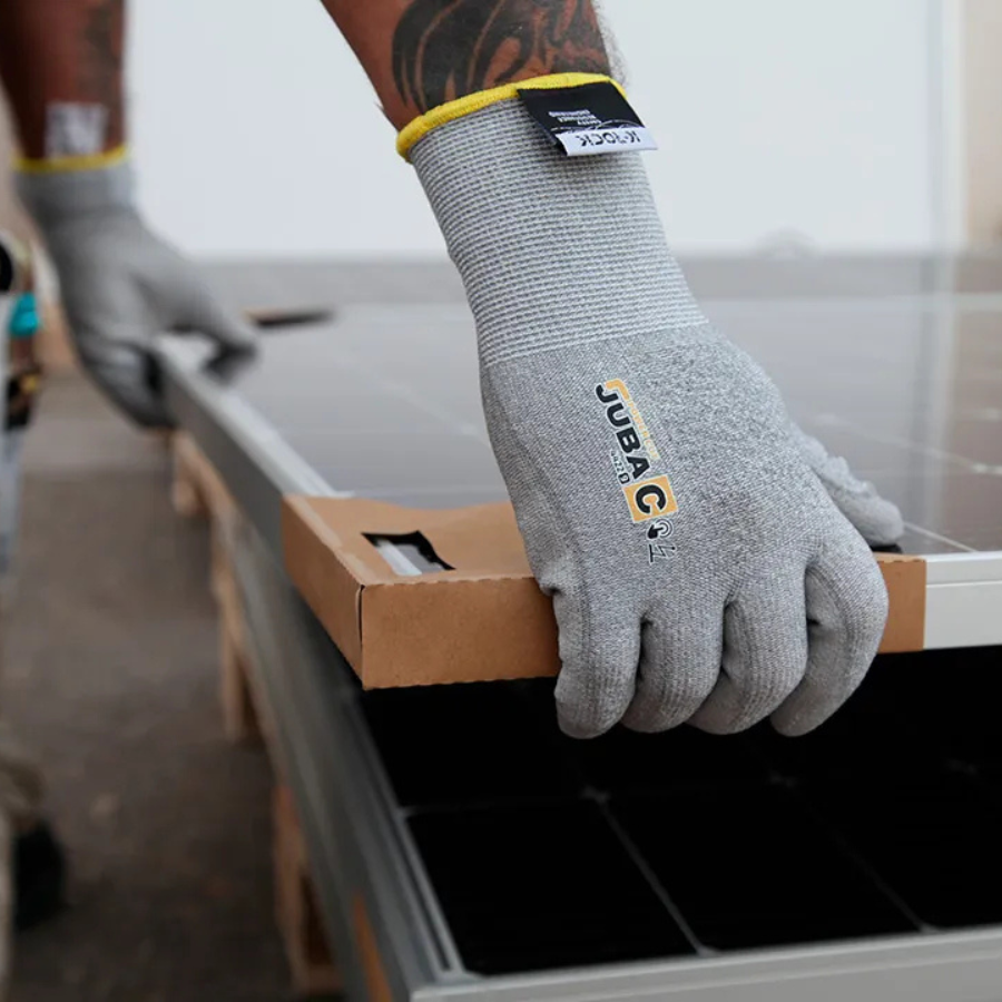 Guante con resistencia al corte que incorpora la fibra K-rock, la nueva tecnología de corte de Juba, recubierto de poliuretano. Antiestático.