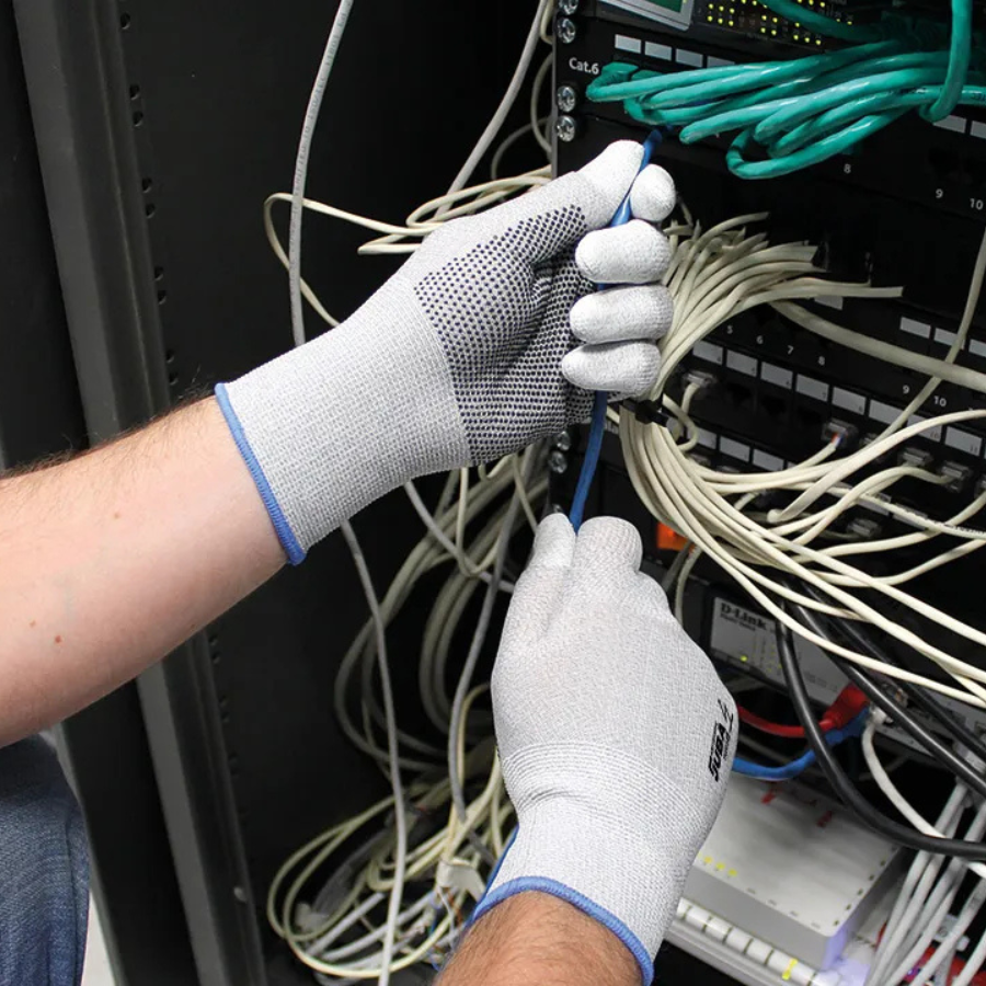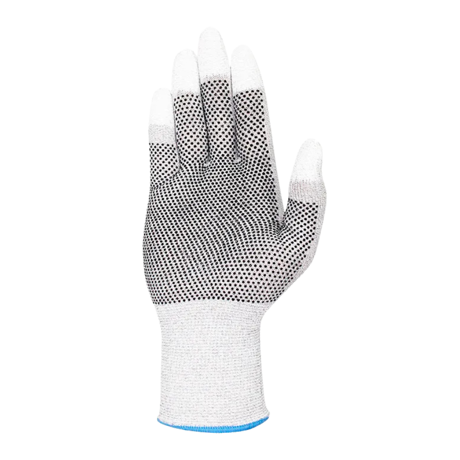 Guante sin costuras de nylon® y fibra de carbono con las puntas de los dedos recubiertas de poliuretano y pequeños puntos de PVC en palma.