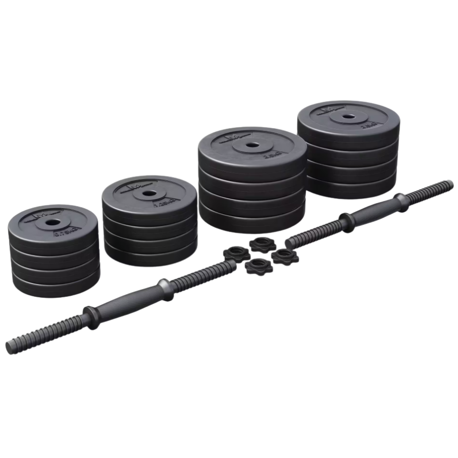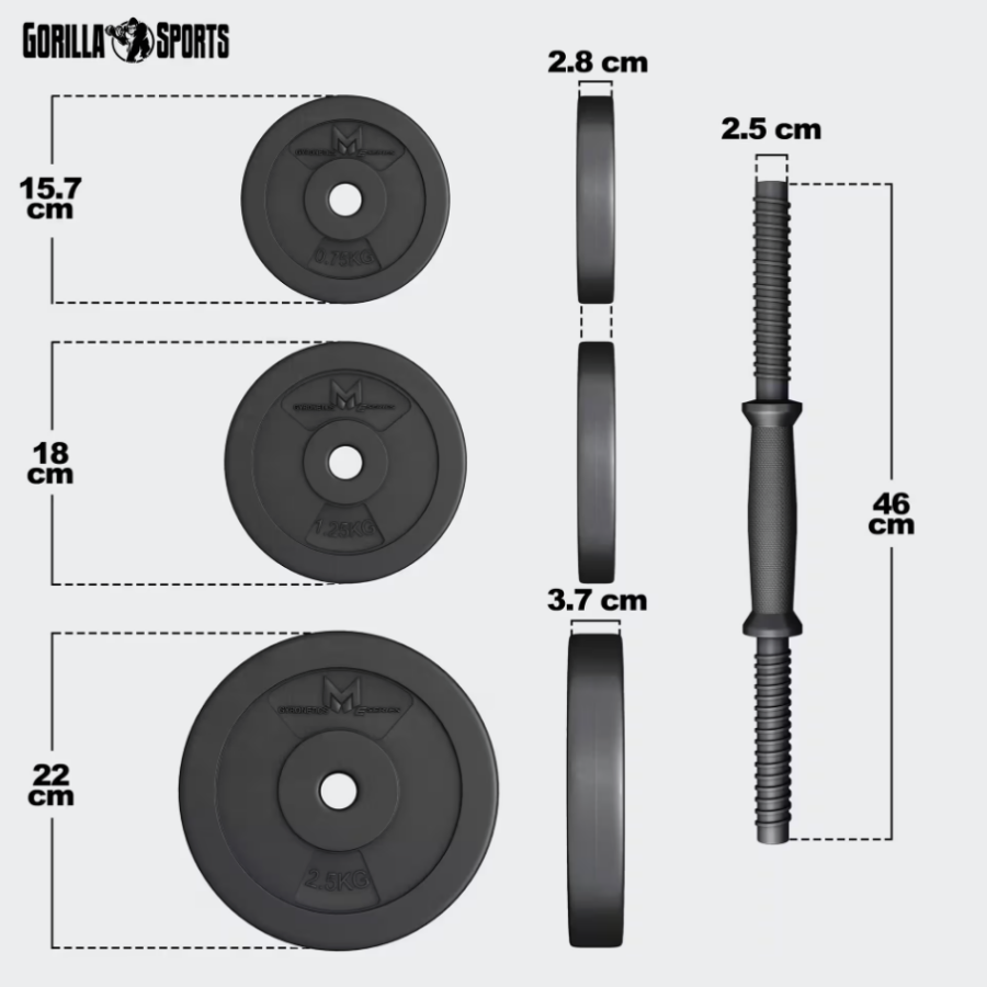 2 x barras de mancuernas de 45 cm – Diámetro: 25 mm (Peso 1 kg) 4 x cierres de estrella con bloqueo de giro 8 x discos de pesas de 2,5 kg 4 x discos de pesas de 1,25 kg 4 x discos de pesas de 0,75 kg Agarres antideslizantes para un entrenamiento seguro Almohadilla de pesas con rosca Peso máximo por barra de pesas: 20 kg Adecuadas para su uso en casa y en el gimnasio
