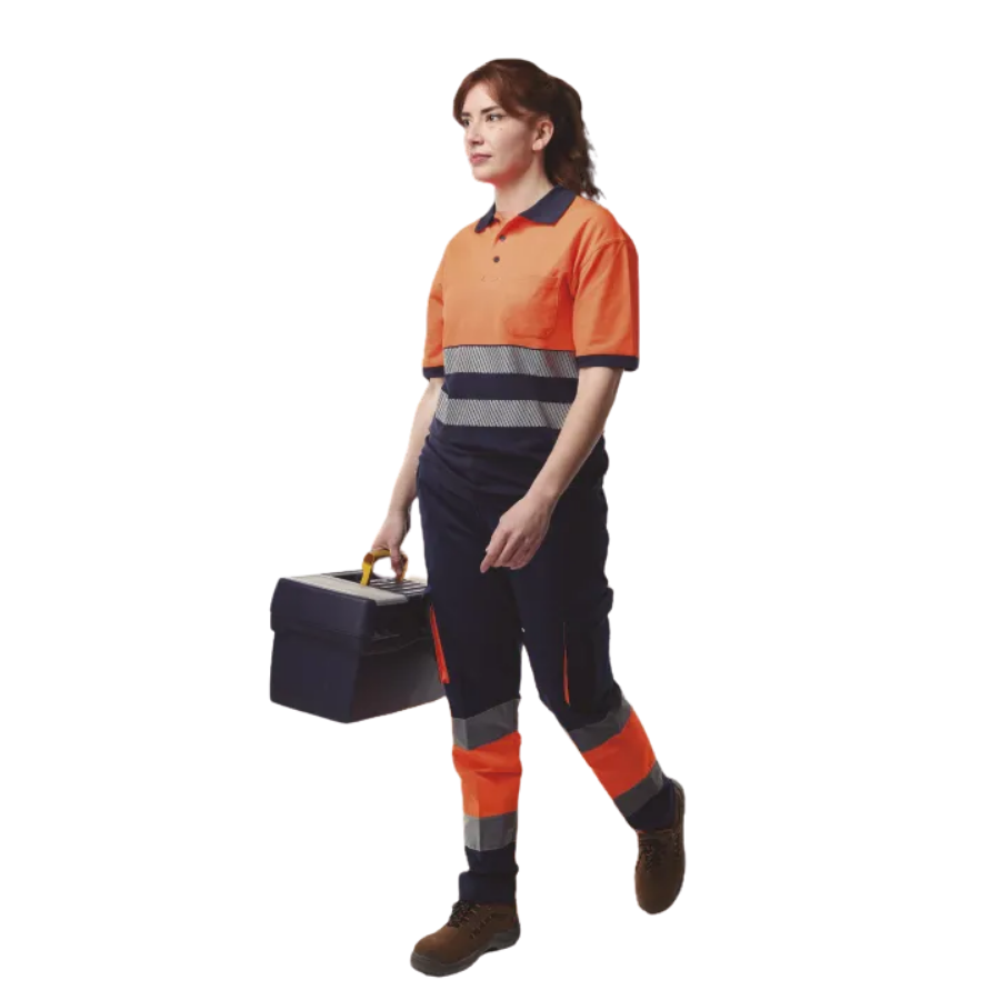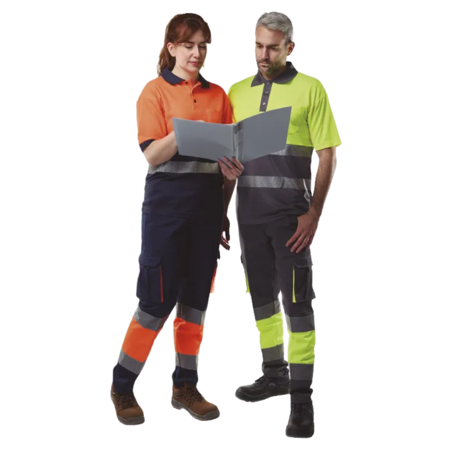 Pantalón elástico multibolsillos bicolor de alta visibilidad con bandas reflectantes.