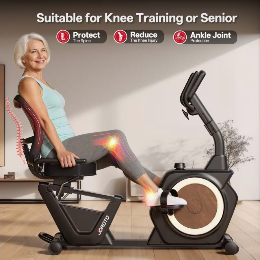 Seguro y Sólido con Capacidad de 400LBS/182KG: JOROTO bicicleta estática para mayores combina diseño cuidado, asiento amplio y transpirable y respaldo ventilado para confort duradero. Su riel electrocinético reforzado con bloqueo de un clic ofrece ajuste seguro, y su marco resistente soporta usuarios de hasta 400 lbs/182 kg — donde el detalle se encuentra con el rendimiento perdurable.