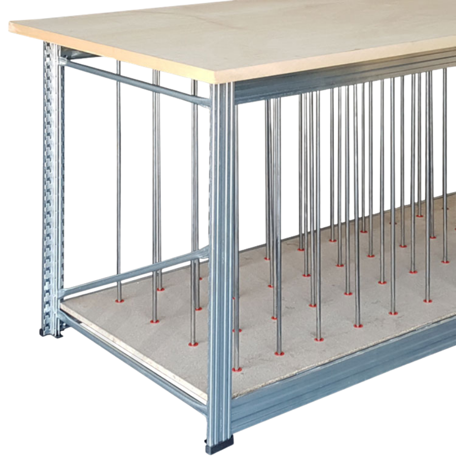 Mesa de trabajo de gran superficie, con varillas de almacenaje vertical en la parte superior. Permite colocar material en vertical debajo de la mesa de trabajo, ahorrando espacio y manteniendo el material de trabajo muy a mano. Es estantería y mesa, todo en uno.