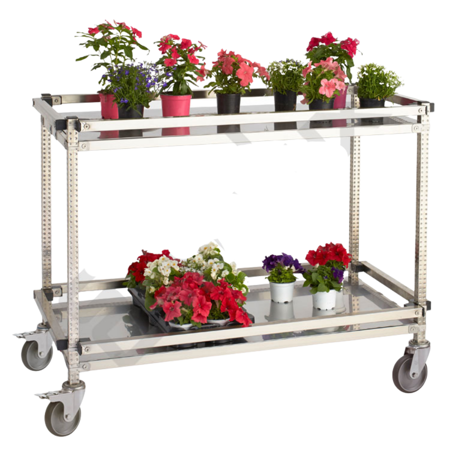 Mesa de acero inoxidable con ruedas para exposiciones de flores y plantas. Los estantes llevan chapas lisas que proporcionan una superficie totalmente lisa. Todos los componentes están fabricados en acero inoxidable. Estas mesas son ideales para su uso en invernaderos, tiendas de flores y plantas, etc., tanto en interiores como en exteriores, para cualquier tipo de clima. Son inalterables con el riego continuo de agua. También son aptas para el sector alimentario, horeca y colectividades.