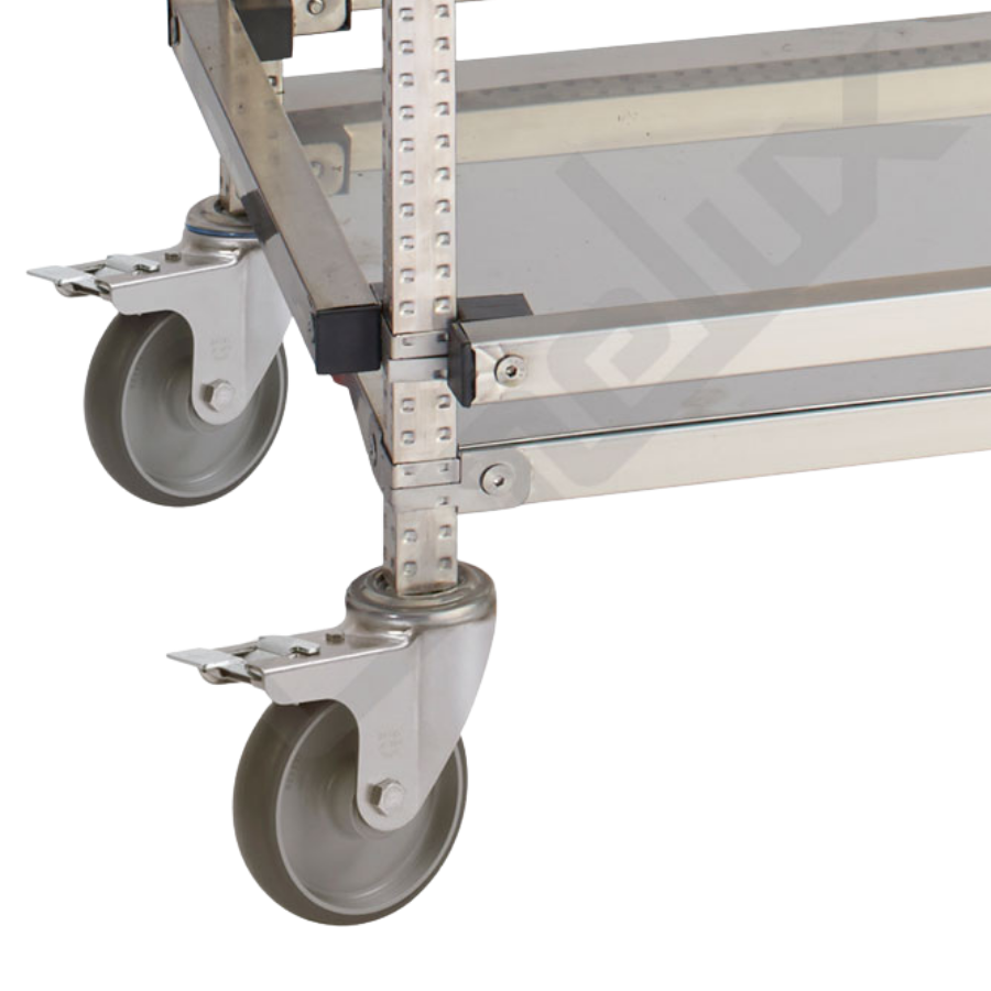 • Las 4 ruedas de goma con componentes en acero inoxidable con orientables de Ø 125 mm. 2 con freno, 2 sin freno. No rayan el suelo.