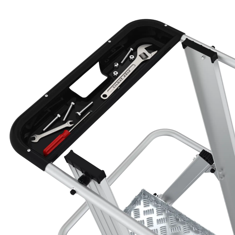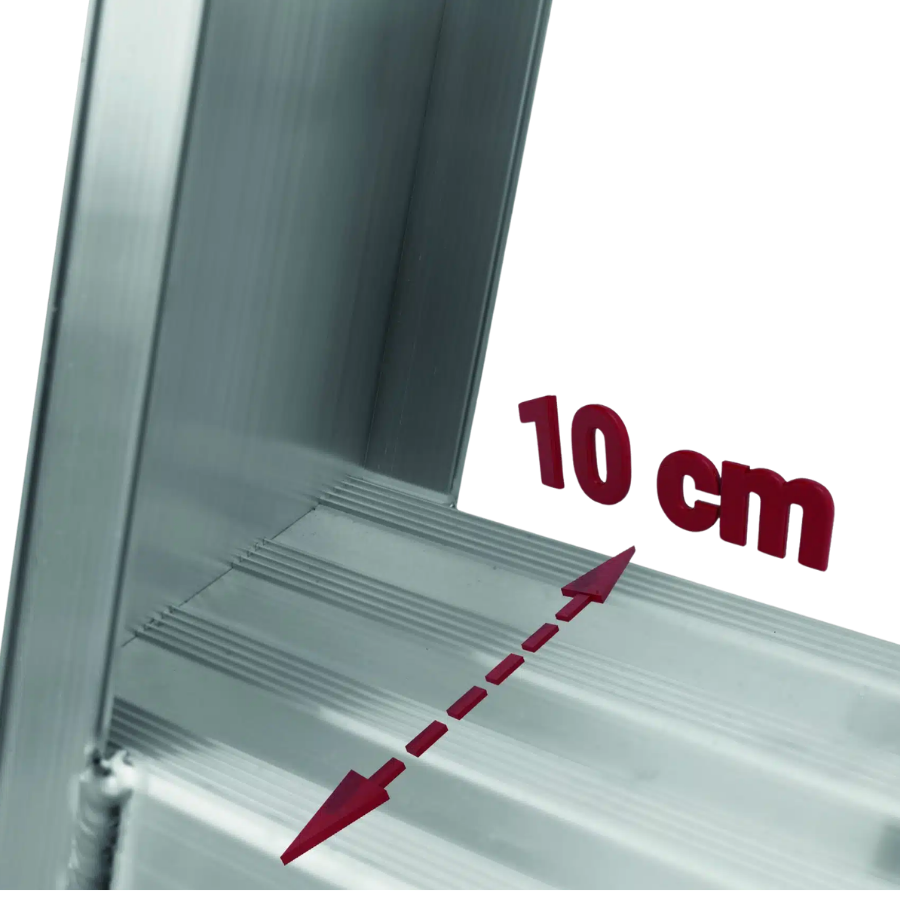 La plataforma de trabajo, con unas dimensiones de 51 x 56 cm, ofrece un amplio espacio para realizar tus tareas con comodidad. Los peldaños anchos reforzados, con una superficie antideslizante de 10 cm, brindan estabilidad y seguridad en cada paso. La estructura soldada asegura la resistencia y durabilidad del producto. Además, nuestro sistema de plegado seguro permite un fácil traslado y almacenamiento compacto. Con una inclinación de subida de 68°, esta plataforma se adapta a diferentes entornos de trabajo. Con una carga máxima de 150 kg, podrás llevar contigo todo el equipo necesario. Elige nuestra plataforma de aluminio con puertas abatibles para trabajar con confianza y comodidad.