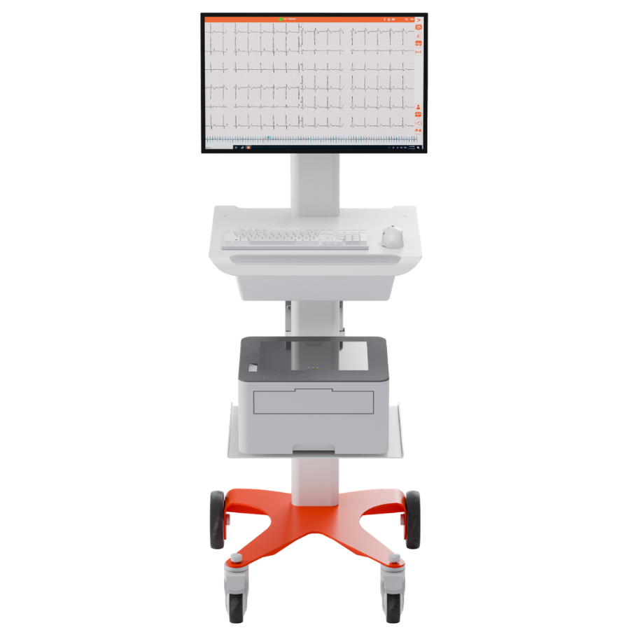 Nuestra solución es  un sistema de ECG de 12 o 15 derivaciones  (+ 3 Frank)   compuesto por software touchECG, unidad de adquisición inalámbrica HD+ (versión HD+ 12 o HD+ 15 según la configuración elegida) y ordenador todo en uno con pantalla táctil de 19,5”. Se integra de forma nativa a  la plataforma ECGWebApp  , el  sistema de gestión de ECG  para  edición,  almacenamiento y reporting , totalmente basado en tecnología web. Además,  el protocolo de exportación DICOM  (que es opcional) permite una integración completa en los flujos de trabajo de hospitales y clínicas existentes.