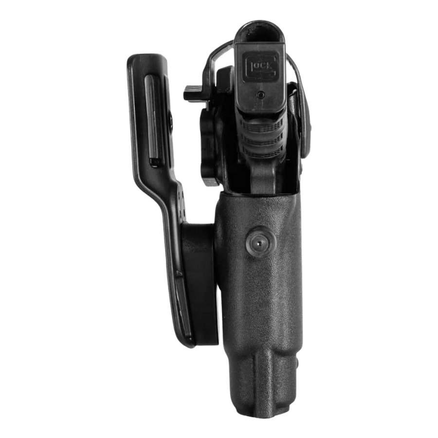 Puerta frontal de protección RDO, plegable y extraíble. Tornillo de retención para ajuste por fricción de la funda en el arma. Tornillo de ajuste para el paso de la linterna/láser. Presilla para cinturón con doble ranura, ajustable para el paso del cinturón de 5 cm a 6 cm, manteniendo la posición de la empuñadura alineada con la línea del cinturón. Forro interior para mayor protección del arma. Compatible con todas las presillas y kits de fundas Vega.