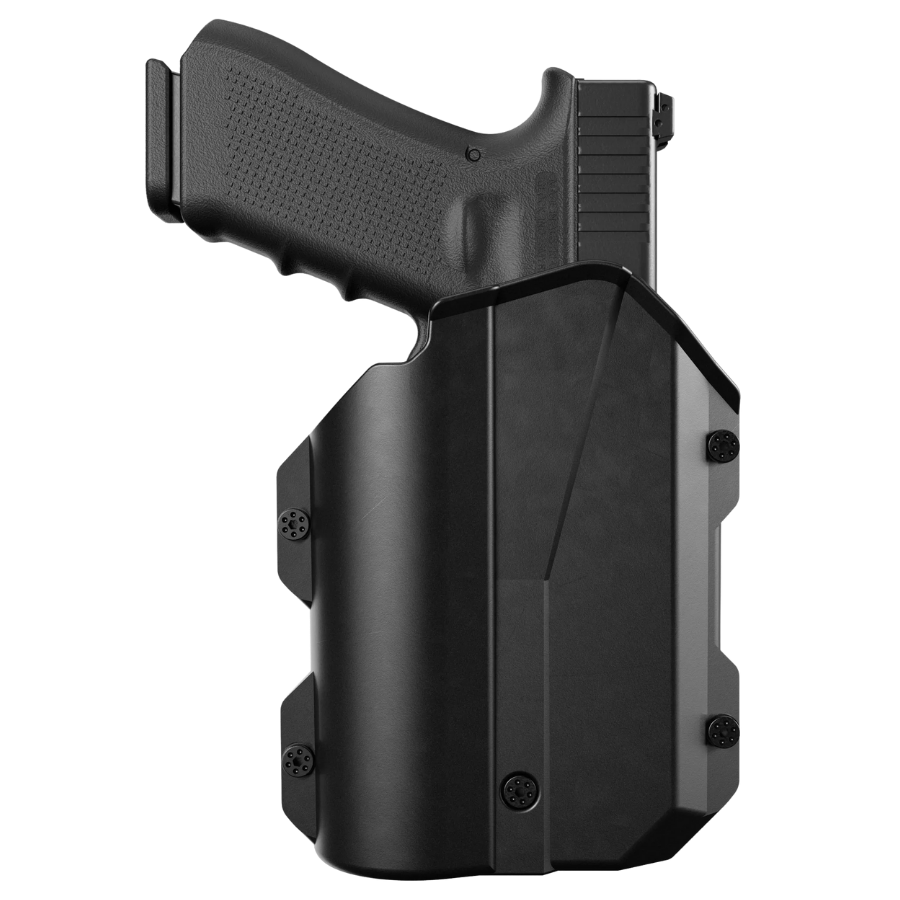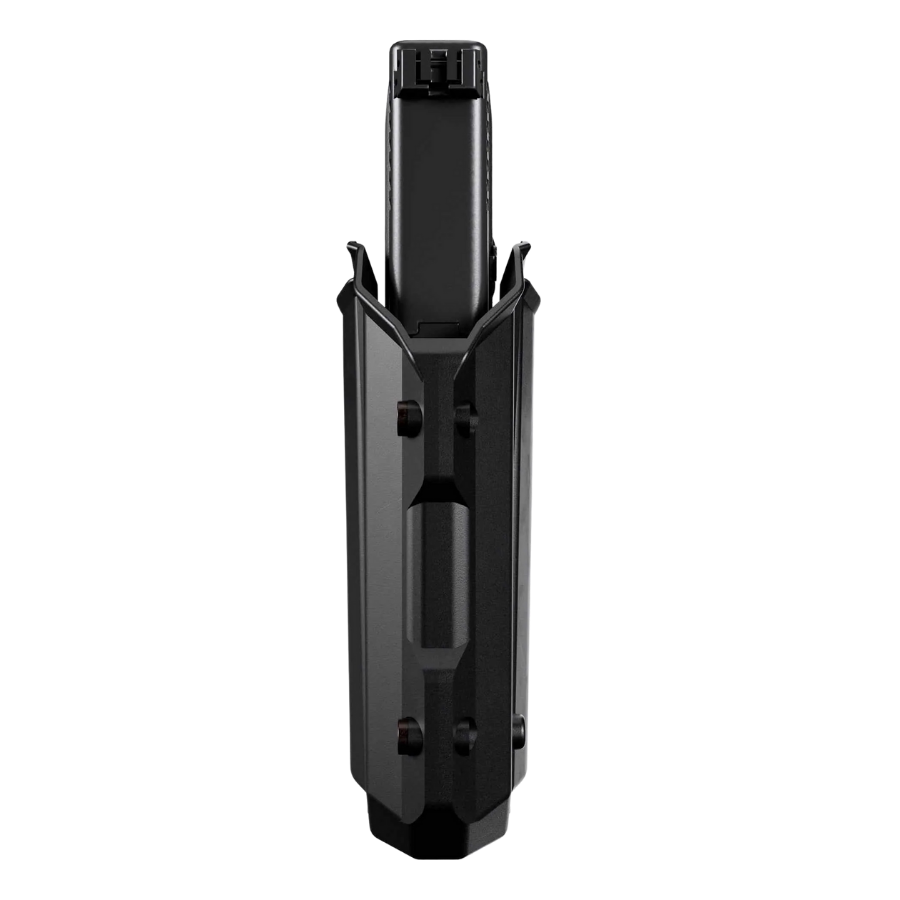 Protección frontal extraíble para mayor seguridad. Tornillo de retención en la parte inferior para ajustar la fricción entre la funda y el arma. Se monta en un kit de presillas estándar de polímero moldeado por inyección, apto para uso policial. Compatible con todas las presillas y kits de fundas Vega. Compatible con la mayoría de las armas Large Auto y Large Auto Compact comunes equipadas con linternas/láseres de armas populares (consultar compatibilidad antes de la compra).