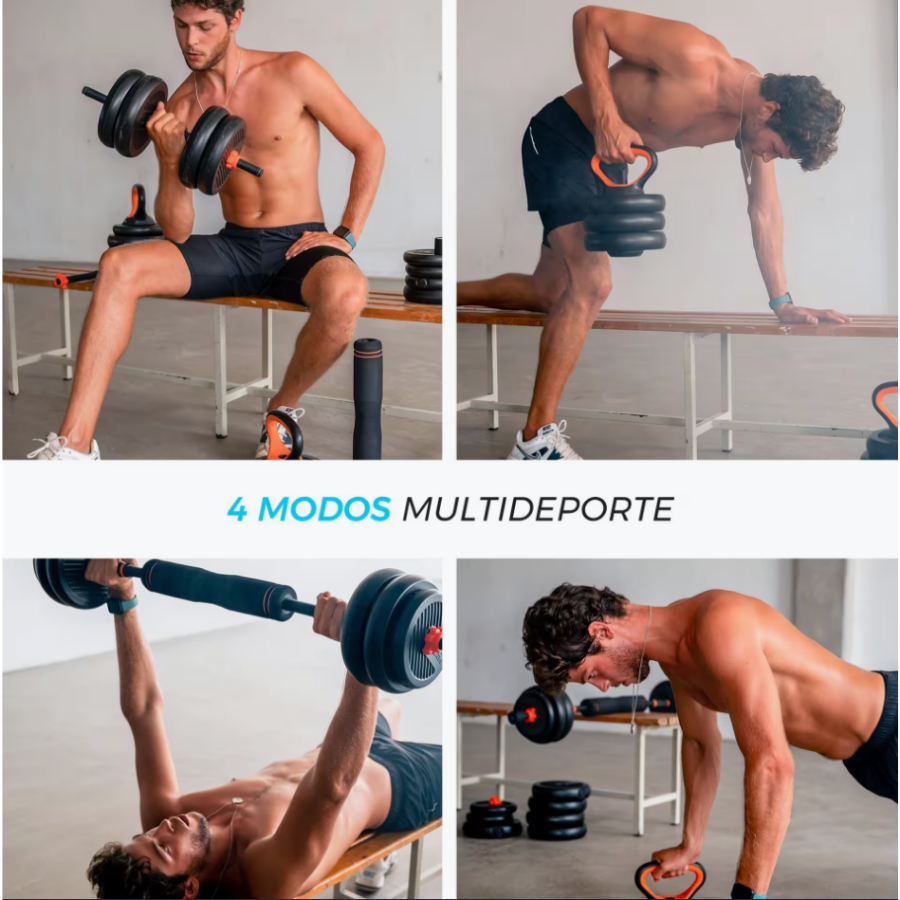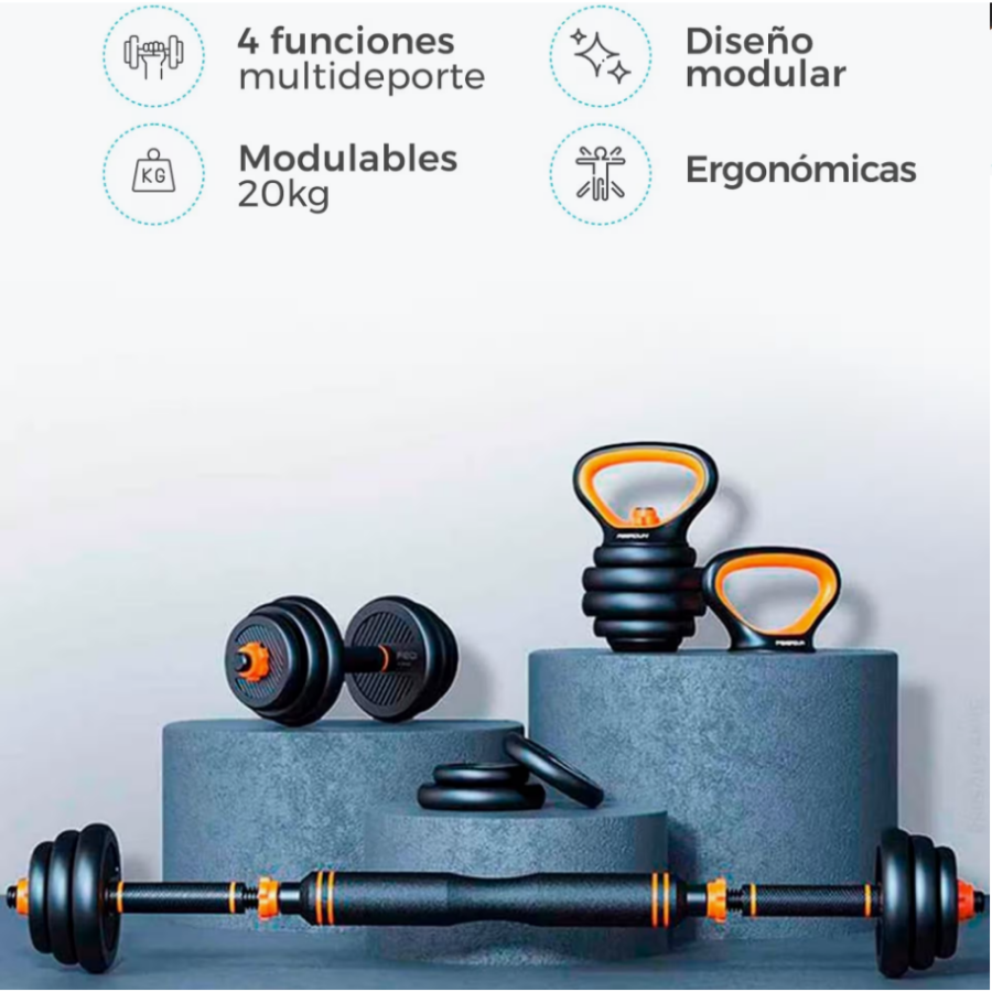 Contenido: 4 discos de 1.25 kg, 4 discos de 1.5 kg, 4 discos de 2 kg, 1 barra acolchada (1kg), 2 mancuernas, 2 pesas rusas, 1 soporte de pesa rusa.