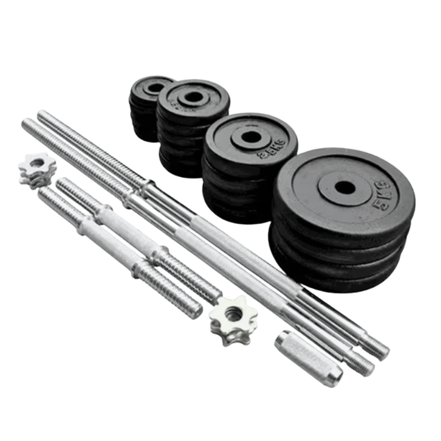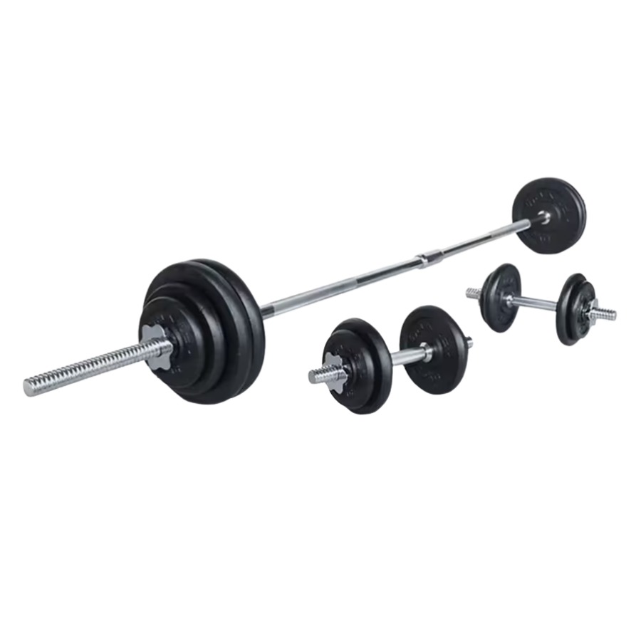 Set con barra y mancuernas ajustables (50kg). Entrena todo tu cuerpo con seguridad y confort. Ideal para todos los niveles.