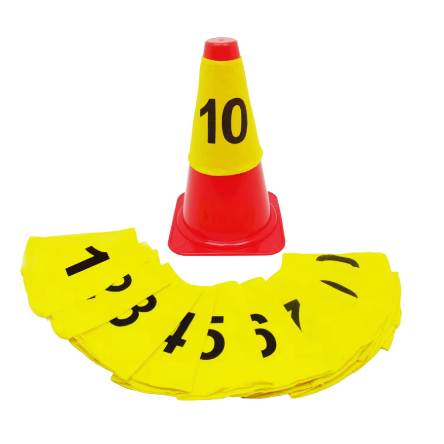 Conjunto de 10 fundas para conos numeradas del 1 al 10 indicadas para conos semirrígidos de 30 cm y mayores. Perfecto para la realización de ejercicicos de psicomotrocidad en clases de educación física así como para cirucitos en entrenamientos deportivos.